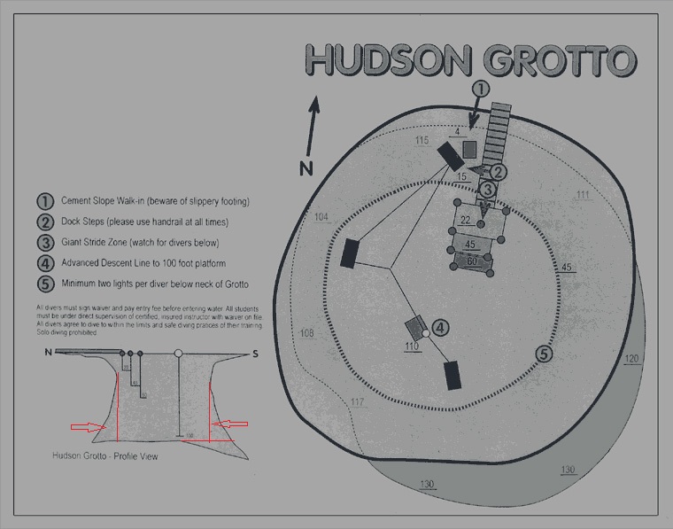Let's go back to Hudson for a sec (map above). There's a down line and platform at 100' right in the center of the sink. Instructors can easily use that platform to accomplish the deep dive in an Advanced class without ever getting near an overhead, but may prefer to use Blue Grotto.