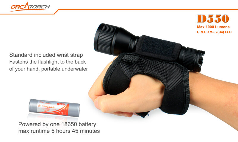 It uses one 18650 battery and has 3 dive light modes, high modes 1000 lumens for 2h5mins, low modes 367 lumens for 5h 45mins, and strobe modes 1000 lumens. It is equipped with a totally sealed magnetic controlled tail switch that can be useful for spearfishing. Besides, it also can work with OrcaTorch WS01 Wrist Strap and HM01 Helmet Mount.