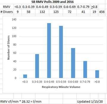 There have been 2 polls on SB, asking divers for their average RMV. Of course, there are many caveats in interpretation. About 2% of respondents reported an average RMV of <0.3 cf/min. Only 1.75% of my dives, for which I have a RMV, are <0.3 cf/min.