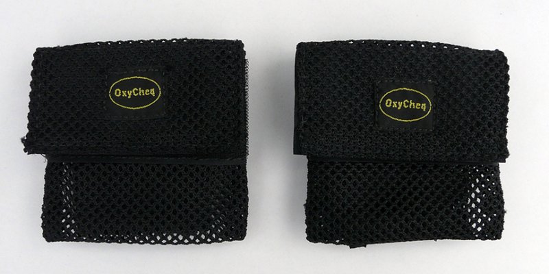 From Oxycheq's website: Used on chest, or waist or for Trim. Fits 2 inch webbing, wide velcro belt loop on rear. Can be easily placed on and taken off. Designed to hold 1 pound or 2 pound mesh weights. Approximate Size: 3.5" x 3.5". Great for rebreathers and cam straps.