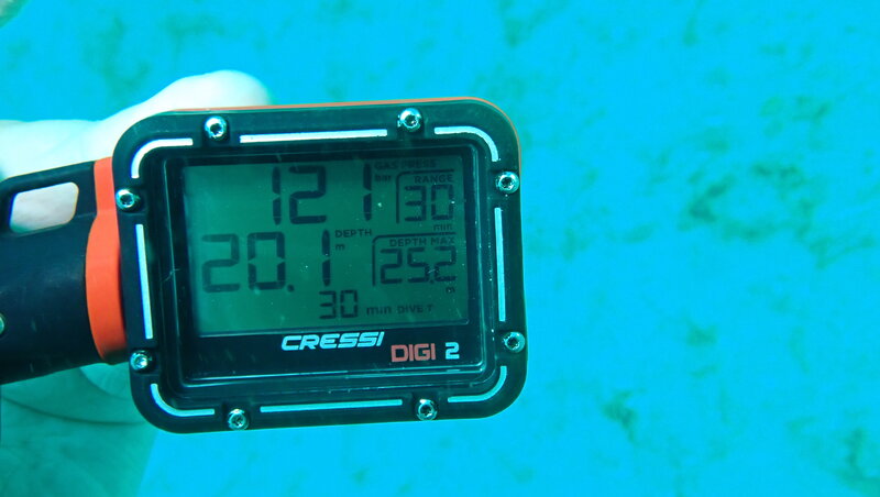 I'm liking my Cressi even more.. after 30 mins into this dive at 20m 121 bar left, my device tells me at current depth and current gas consumption I have 30 minutes to 50 bar. Top right corner where it says range. So too bad if the guide's Suunto wont let him stay at that depth for the dive. Did not calculate sac rate but had a tank with 215 bar starting.