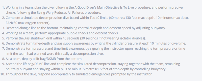 I'm sure they exist, but I have never seen a PADI tec instructor capable of performing the skills to the written standard. The courses are generally not taught to the standards, and there is no repercussions for **** instruction which is why I consider the entire agency a joke. I have personally filed a complaint against a tec instructor who ran out of air while teaching a course I was in. They never responded and he became a course director a few years later.