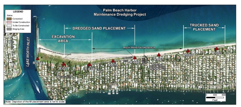 The Dredge E.W. Ellefson, a cutter/suction dredge, is expected to remove approximately 191,000 cubic yards of shoaling material from the entrance channel and the settling basins over 2-3 weeks. Operations will continue 24 hours daily, seven days a week, until completion. Dredge material placement will be pumped and screened onto the adjacent beach at Palm Beach Island, immediately south of the inlet’s south jetty.