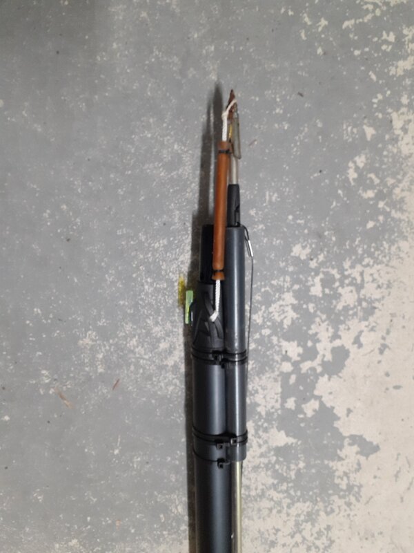 Whether I take it on a boat or just shore dive I want it unloaded, obviously. So, I made a short tube out of pvc with flat on one side so it would snug up to the barrel and zip tied it to the body of the gun so I can stuff the shaft in it. I made a little keeper to hold it place..the shaft line winds up as usual.