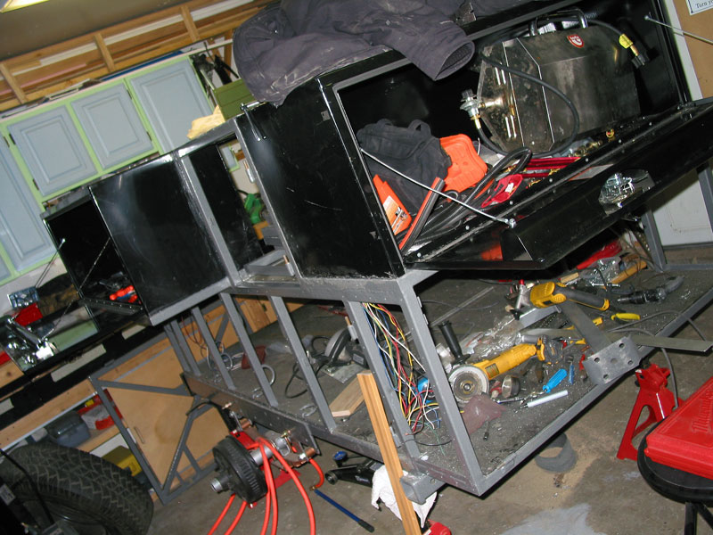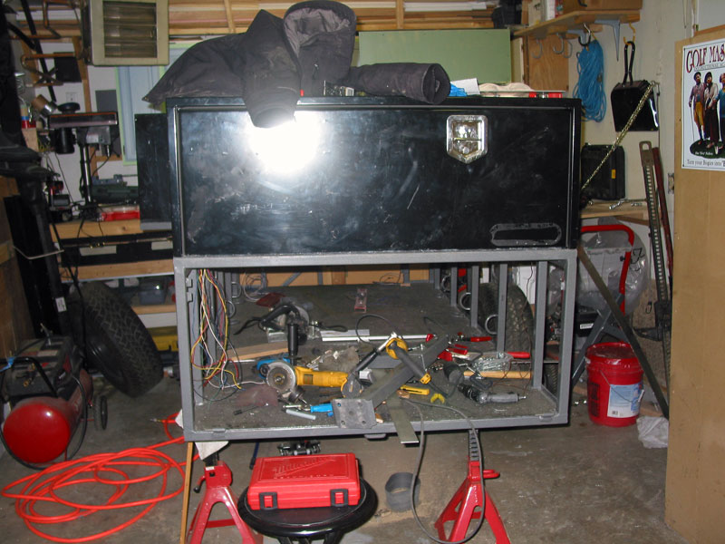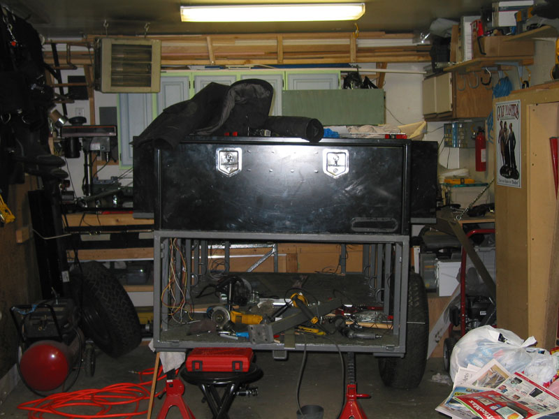 FWIW - this "scuba support trailer" (AKA adventure trailer, AKA off-road trailer) is going to be pulled by a Jeep. I discovered last summer while camping that, with a soft top (or no top) vehicle, item security is a real problem. So, I'm building plenty of security into this trailer hence the high quality steel (and high dollar cost) 48x18x18" boxes (3 of them) for the most valuable stuff. It's also extremely heavy duty, and designed to go anywhere the Jeep will go. It has a number of "scuba specific" features - such as welded-on shackles inside, for ratcheting tie-downs to hold tanks, such as welded-on shackles on the rear bumper to give a place to bungie rig setups in place (to keep them from falling over), the ability to sit at the rear door (not seen in photos) and put your gear on - without smacking your head (well, at least without me smacking my head - if you're taller than me, you may be out of luck), etc.