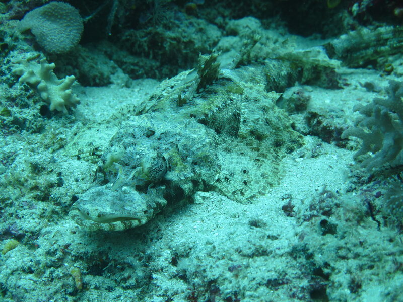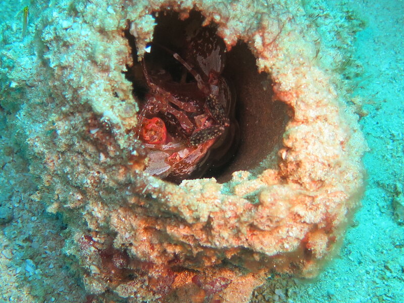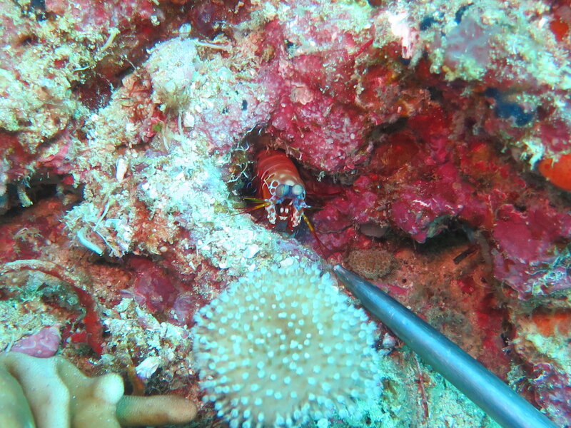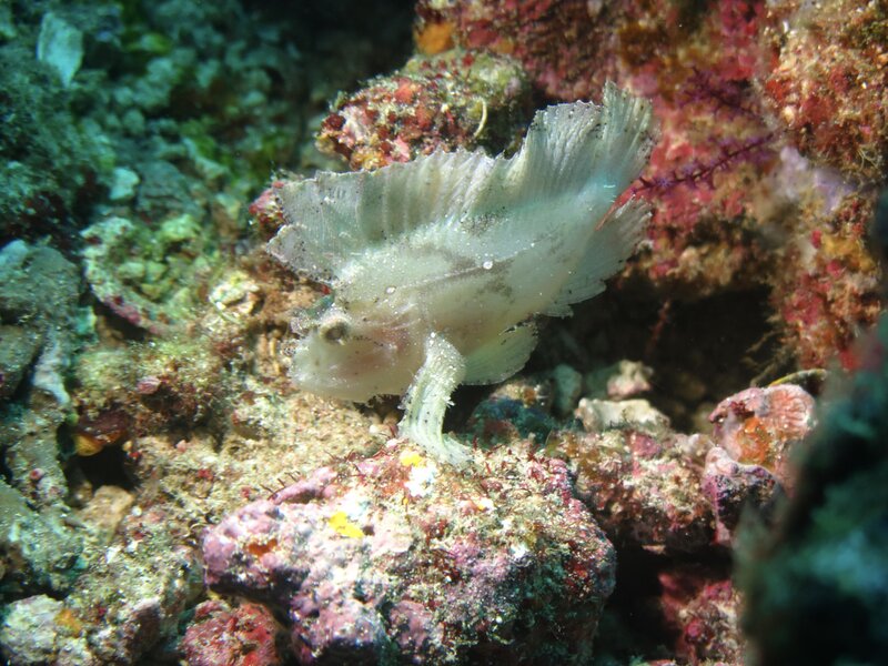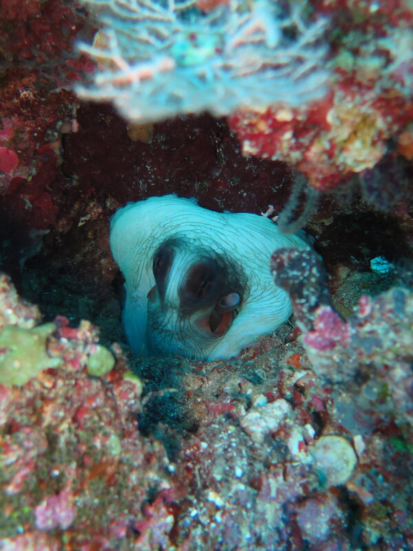 My eyes are weird. I’m a bit far sighted in my left eye, quite near-sighted in my right eye (which has a hypoplastic optic nerve and a small cataract; imagine scrawling a spider web pattern with Chapstick on your right glasses lens and trying to read through it), and I can’t make out the tinier macro subjects well. I use an old Canon G16 in a Fantasea housing for snapshots; usually my only custom setting besides underwater scene mode is switching between flash-off and force-flash. On this trip I eventually broke down and started switching in and out of the macro setting, so setting up for a shot, I’d fiddle with the camera settings while trying to get to the guide, hover, clear my mask (while he thinks he’s pointing out where the creature is to me), then get 2 or 3 shots, hope I’m lucky and try to back out and move on.