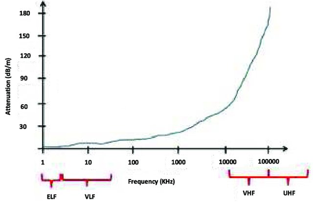 Don't know where they got that info from but it is a study on" Optical Transmitters" and not Radio Transmitters. I found my info in a study that tested loop antennas 100ft apart underwater in sea water and they found that 10W of RF power at 30Khz was needed to keep the signal clean at 100ft. I suspect they used much better receivers than what is found in a DC,