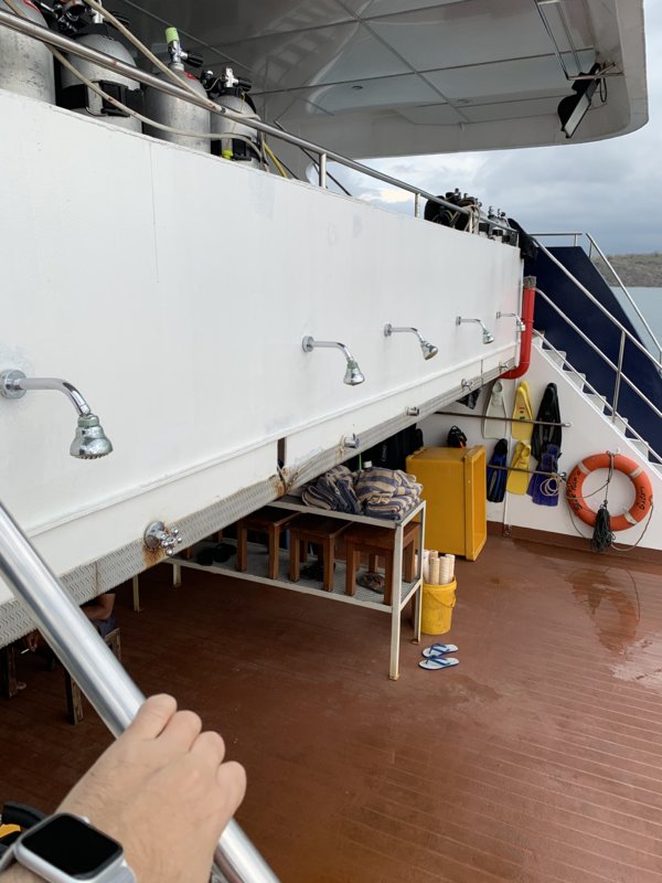 Tat is a great picture of the loading deck in calm seas.Yes, 5 showers with soap and shampoo. After our dives they had benches for you to sit down and get your wetsuit off. Anytime I struggled to get my hooded vest off, one of the crew would help me.
