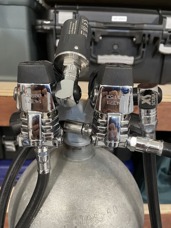 As I have mentioned before, all of my single-cylinder dives are done utilizing a Y valve. I also sling a 40cf cylinder on all dives so If I switch to doubles (only used for deeper deco/mixed gas dives) the 40cf is switched out for 100% O2 rather than the same mix I am running in my single cylinder and pony which is usually 28%.