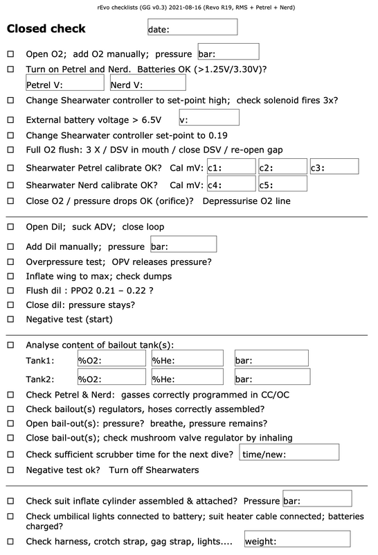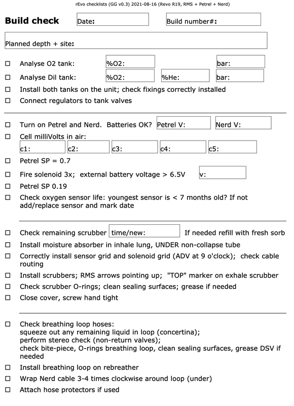 I use some paper checklists for the Build and Close checks. These are in double-sided A5/half letter format. I write on these with a pencil and keep them after the build. There's boxes to note down pressures, voltages, plus check boxes.