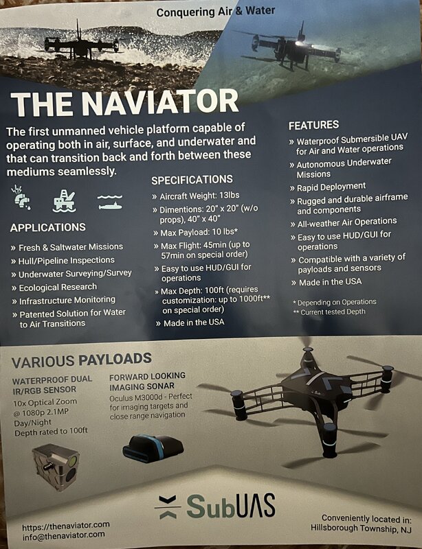 My buddy’s company that does a wide variety of maritime work all over the world was pretty interested in the cost savings of being able to fly and dive a UAS several kilometers off shore to inspect a subsurface requirement without having to put a commercial diver in the water.