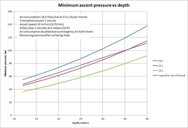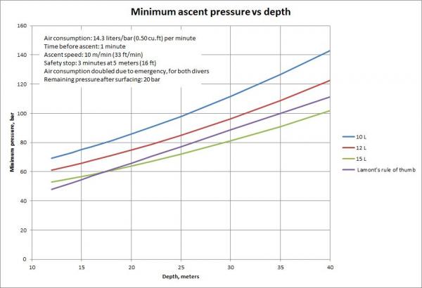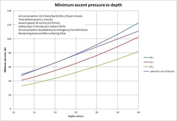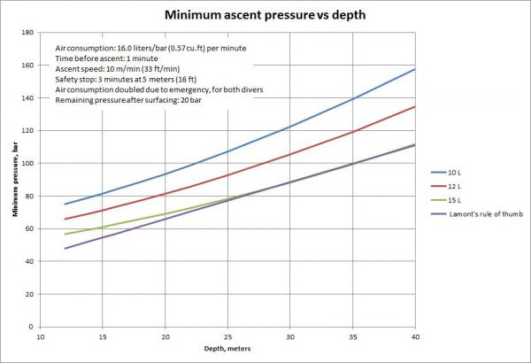 So, if the goal is to surface with 50 b, our diver has to leave the bottom with about 71-75 bar.