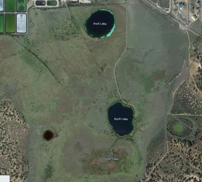 I have dived what is called Post Lake on this screen shot from Google Earth. We have always called it Swan Lake, which is what the filled in sink to the south is called on the map. Post/Swan Lake is only a bit more than 60 feet deep. It is always full, even though it has no inlet or outlet. The ground around it is essentially a swamp.
