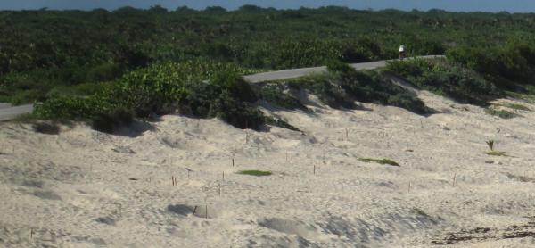 You can see in the photograph #1 and #2 that there is a lot of Sargasso, but you can also see in the enlarged portion of the image #2 that there are also a LOT of new turtle nests. Each red stick marks one nest. There are dozens in the enlarged portion image and several hundred in the large original image .