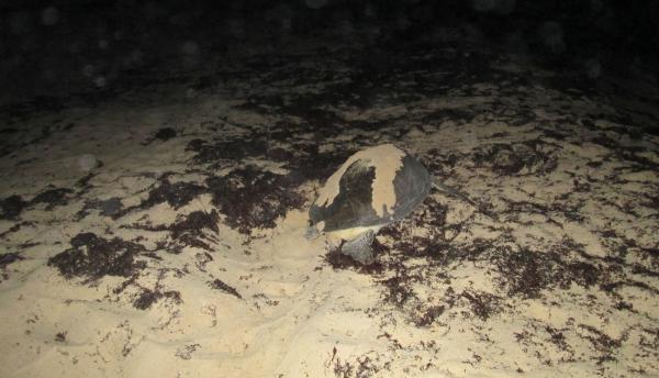 Last night, around 9PM, the turtles started coming up on the beach to lay eggs. They seemed to have absolutely no trouble at all with the Sargasso. In fact, it looked to me that that was the easiest part for them; imagine hauling a full ice chest across the sand of a beach. Now imagine dragging that same ice chest across a grassy lawn. That is what it looked like. They could get a grip with their flippers in the Sargasso, the slide across it with no problem. When they scuttled across the sand, their flippers often lost grip and flung sand up in the air.