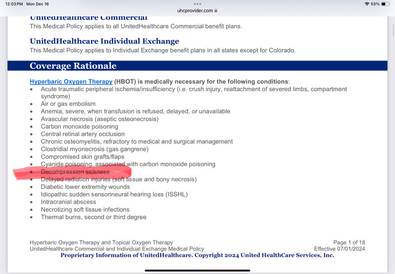 Please check that this includes out of the country coverage and special transport back to the USA.I’ve been in the insurance industry for almost 2 decades and am not aware of a recreational scuba diving exclusion. It’s no different than rock climbing, skiing, road cycling, mountain biking, football or other physical activity where accidents happen. I would be curious to review the group health plans you are familiar with as that has not been my experience. Here is UHC’s Hyperbaric Oxygen Therapy and Topical Oxygen Therapy policy, applicable to all commercial and individual exchange policies. Plus when you have multiple insurance policies, subrogation occurs often prior to claims adjudication. No insurance company wants to pay if another policy possibly will. It may take paying out of pocket first with an out of country emergency (e.g. many international providers don’t accept US insurance and you have to submit the claim yourself later) so for some having the funds to do this may be problematic and thus if DAN will pay ‘on the spot’ that can be an advantage to having dual coverage too. That though isn’t a concern for us.