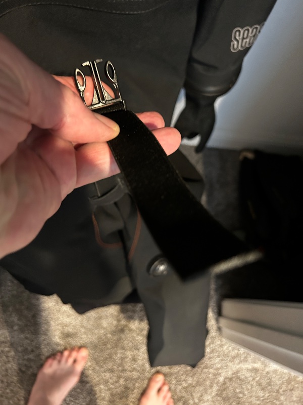 Look in this thread, I posted a picture when I got my suit, it's all black with orange stitching. Orange is subtle, so it does not really scream at you