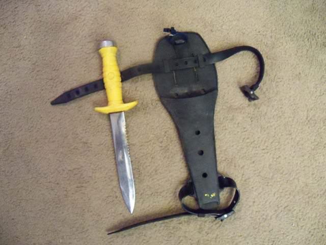 Ok I'll play too, below is my trusty Sportways Navy knife w/ 7 "" blade. I bought it in 1970 or so for $8 or $10, and have used it every dive since. I used it on scallops, urchins and such. I strap it on the inside of my calf as every kelp diver knows, you never strap it on the outside of your calf due to kelp entanglement.:wink: