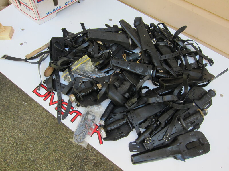 I guess burglars pick up quite a few, I lost two Japanese original “Sunfish” dive knives to a burglar, there is one in your pile with its metal cross guard near the top of the photo, just peeking out from under another sheath. The advantage of these knives were you could dismantle the knife completely for post-dive cleaning.