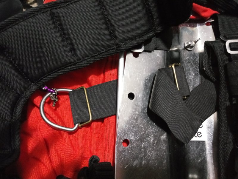 I just had a clever idea for the side-bungee. It's 2-inch elastic, a 2 triglides, a d-ring, and a clip. I'll want to use better triglides & a replace the purple aluminum clip for the final version, but I like that I can just use the backplate tank-strap slots & adjust this easily if it's too loose or too tight. I'll probably want that ease of adjustment because I'll run different sizes of tanks. The elastic also looks cleaner than bungee-cord.