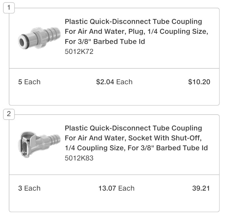Yes - but McMaster-Carr don't ship to Australia - and we don't have an equivalent of them down here. It's not just understanding the quick disconnect sizes but also the hose size - because as you have previously found - the black spiral wire reinforced hose is not fit for purpose - for several reasons, and so I am going to fix all of the problems that Sitech have engineered into their product. I come from a background in subsea engineering - we fix all the problems that get sent to us before we put anything in the water - it makes for a much less stressful life. I think I've found a place where I can obtain a quick disconnect that has a 5/16" barb on the female and a 3/8" barb on the male part of the quick disconnect - so then everything will all match the size that they are connecting to.