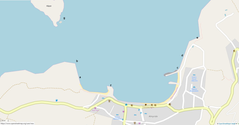 The cliff (a) is relatively nice. The depth is around 1-3 m near the cliffs and there are nice rock formations and lots of juvenile groupers, crabs and other typical fish for this region. The above water scenery is also lovely with high cliffs next to you. The cliff material actually has fossils in it so if you are lucky you can find fossils as well. If you swim more north (b) there is a sharp rock which I named “shark tooth” rock. There the sea opens a bit, as the cliff ends and there is subsequently more colorful algae and also more fish. There are also other large boulders and water is slightly deeper,max 4 meters or so. The island (g) has deeper water behind it, so for more serious free diving and snorkeling, that’s the place to go. I did not go there myself. However, if you go, you must be careful with boat traffic and a dive buddy and a paddle boat are probably a good idea. If you swim from point a towards point f, you will probably see some sunken stuff, such as sun beds etc. garbage. The small rock formation (f) is so close to the shallow sand beach so the visibility is affected especially in windy days. However, this is nice place to get yourself adjusted to local conditions or to go snorkeling with kids.