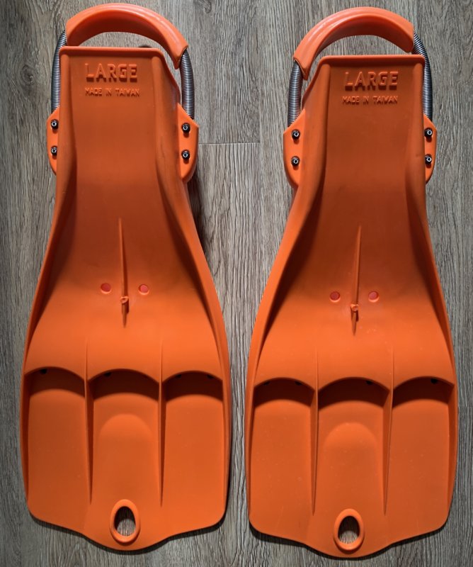 Very lightly used large orange Deep 6 Eddy Fins. Recently exchanged the fins you see in my profile photo for the set I have now, then decided to go with heavier fins for my floaty feet after 4 dives. Rinsed in fresh water post-dives.