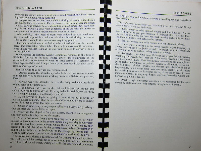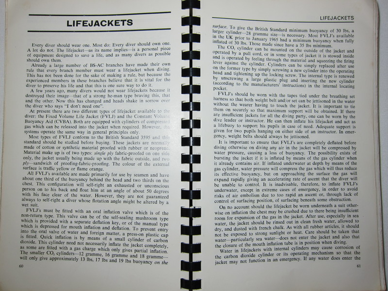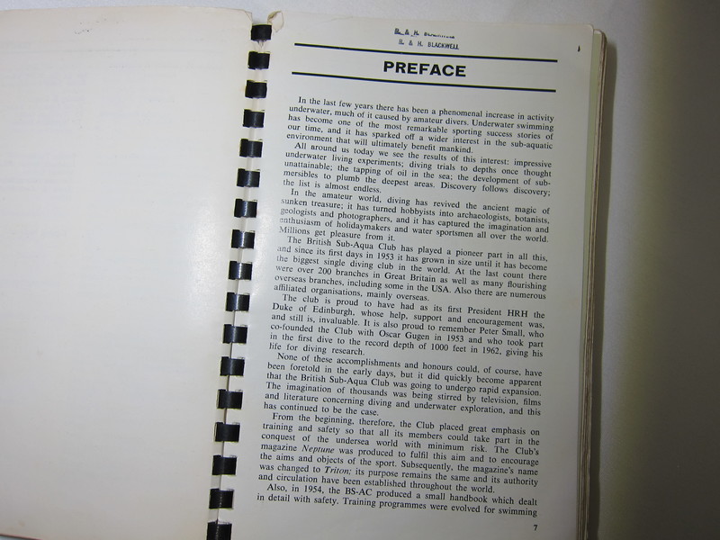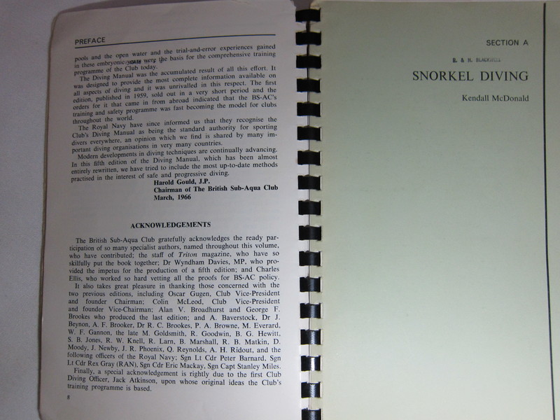 I remember reading my dad's BSAC scuba manual when we lived in Singapore in 1968/9. Alas and annoyingly I don't have that manual, but loved reading it as a child (burst lung sounds great!) and always wanted to join him on the scuba trips. I remember it was a wire-bound manual.