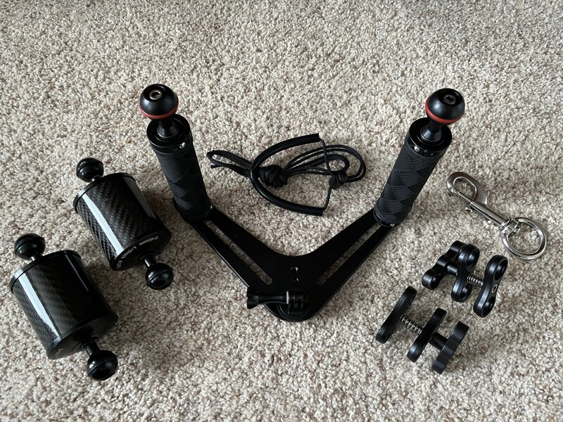 The sweeping delta design and solid aluminum handles dramatically improve stabilization over other trays for smooth steady video. The float ams provide buoyancy at the top of the rig and positions video lights outboard dramatically increasing lighting options. Many of these components received fresh paint recently while I was working on other bits of kit, so the unit looks new. Includes tray, 2x handles, 2x ball mounts, 2x clamps, aluminum camera mount and 2x carbon fiber float arms. The float arms have less than 50 dives on them. Assembly includes a large stainless bolt snap, lanyard materials, rubber washers and stainless hardware.