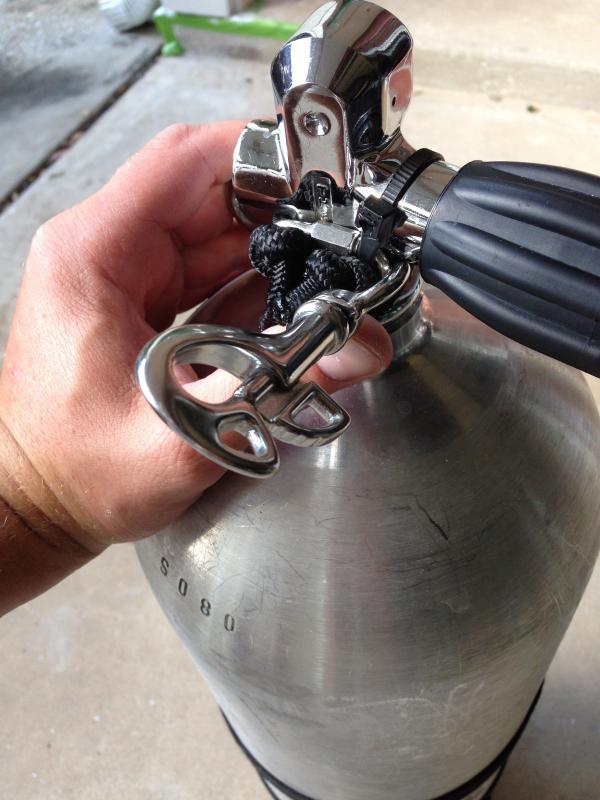 First you take a piece of bungee and wrap it tightly around the neck. I was shown to take a quick link and put a knot in the bungee so it holds without pulling through the quicklink. Then place another quicklink(for clipping your reg) and the snapbolt style of your choice( I prefer butterflies) on the bungee. Wrap the bungee around the neck of the tank and run it back through the quicklink. Once you get it positioned, add a ziptie to keep the quicklink from moving. Up until this point it's similar to Edd's I believe. Now pull the loose end of the bungee so it's really tight around the neck and put a knot in it so that it stays tight. Being tight is important. If the bungee's too loose, the tank valve will have some play when clipped onto you. Here's photos illustrating up until this point