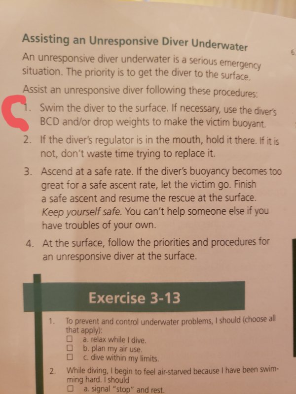 But we've got an AOW student rescuing a grossly overweighted diver with a shrink-wrapped dry suit at depth in dim light and possibly both are descending and/or at a depth the rescuer has never seen. There comes a point where you have to say I can't complicate this for rescuers by becoming the second victim.
