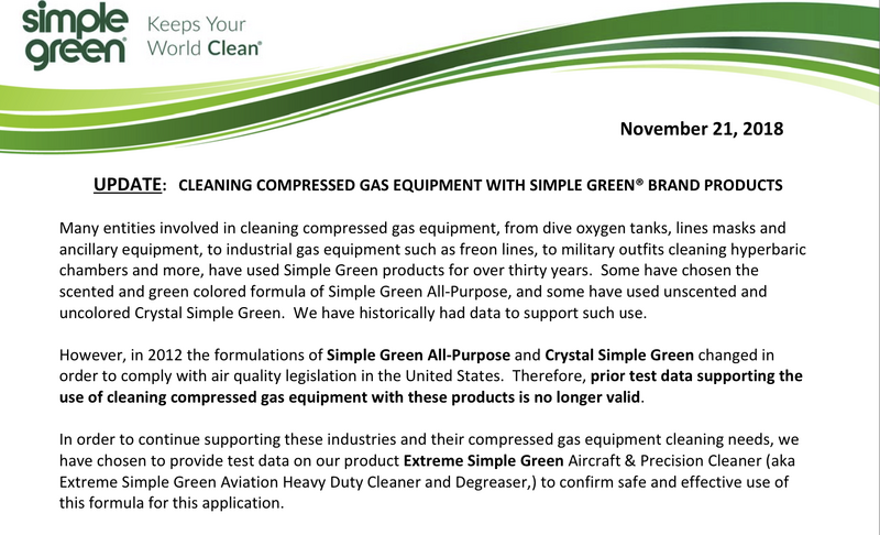 Simple Green had to introduce a new product, Simple Green Extreme, for O2 compatible cleaning. Simple Green Extreme still does not have rust inhibitors like Blue Gold.
