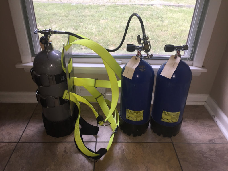 Hmmm. What could be simpler/easier than what's pictured here? Backstory: I was draining down my HP 80's to take them in for their hydroes. Got distracted, and allowed them to drain empty. So, of course, I had to grab another cylinder (here, my OMS/Faber LP 66) in order to put back into each HP 80 a couple hundred psi. (Note: I had to use a 300 Br DIN adapter on the HP 80's because my equalizing whip has A-clamps on both ends.)