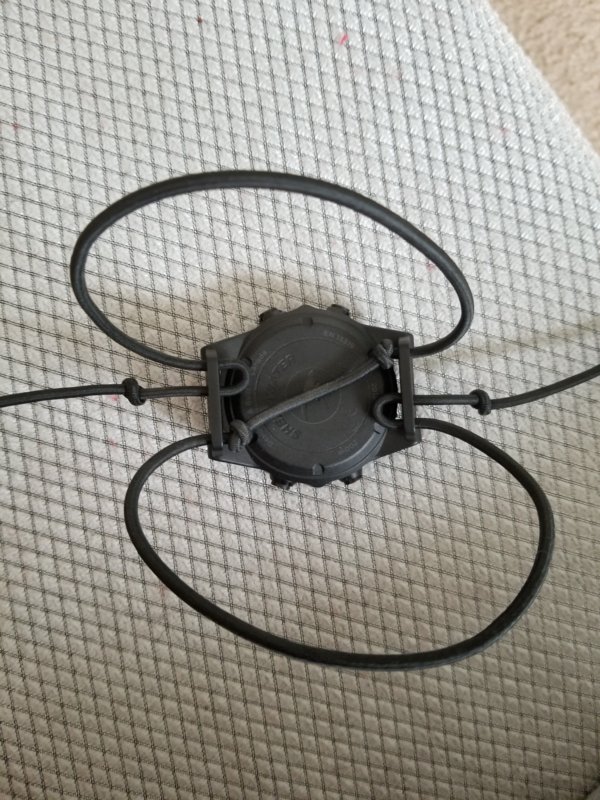 I kept it as one long piece of bungee. But, the two knots in the middle section will ensure that if the bungee breaks anywhere, there will still be at least one piece of bungee holding it all on. And, having the bungee looped through under the back of the Teric ensures that if I break one strap pin, the computer will stay attached.