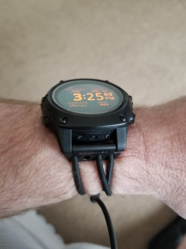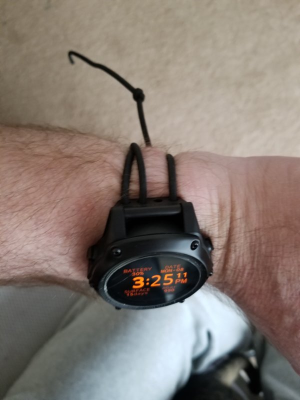 It's all cool except for one thing. This bungee is pretty stretchy - when you're talking about 1 length. When you're stretching 4 lengths of it, it's pretty stiff. I set it up so that it is just snug over my bare arm, just a little up from my wrist. It's pretty stiff to stretch the bungees enough to slip over my hand. I haven't tried it yet, but I am afraid that trying to stretch it enough to get it on over my Kubi dry glove rings is going to be very tough. And, once on, it might squeeze my arm too tightly with my drysuit and a thick undergarment on.