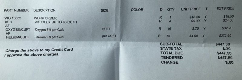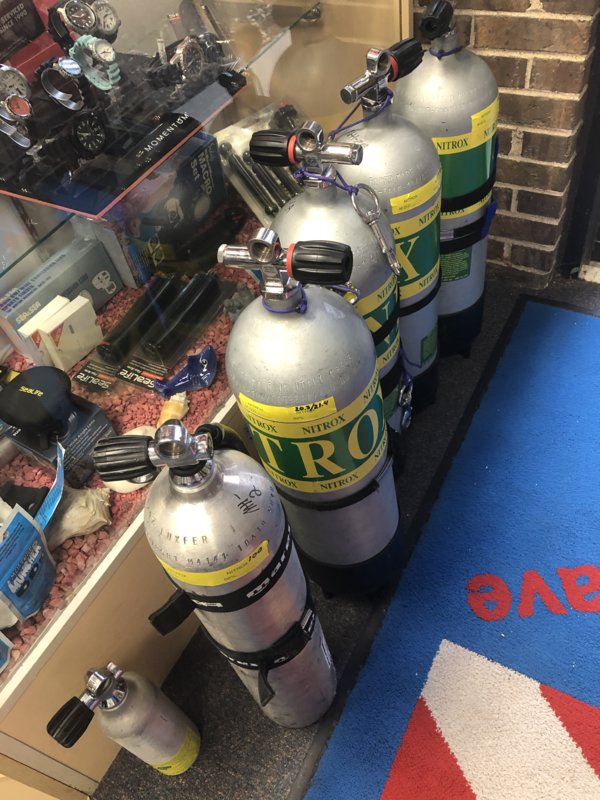 Just got home from getting my tanks. 4 x LP85 filled to 20/20 (approximately) to 3000psi. 1 x AL40 with 100% filled to 2200psi, and a 6cft suit bottle air fill and a VIP on the suit bottle, although the shop just charged me $2 for the tank O ring and slapped the VIP sticker on. Even though I have a whip, I wanted to ensure I could get the suit bottle filled at a shop if needed.