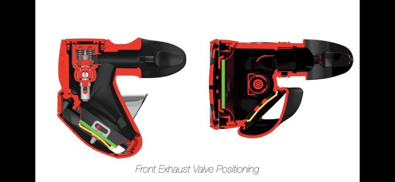I just looked at a top down view of the TFX to make sure. The diaphragm and exhaust are both directly below the actual regulator - not in front of it.