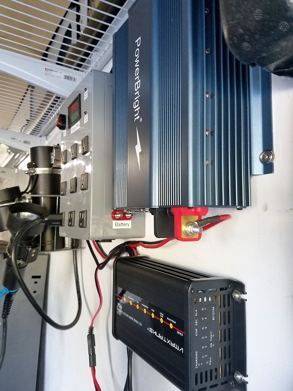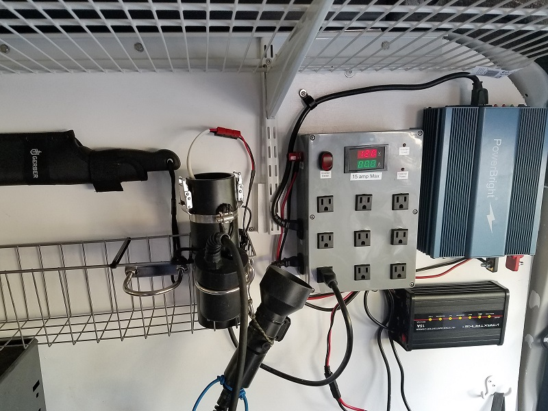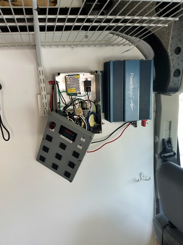 I also installed my custom charging panel. It switches from vehicle power to shore power whenever the van is plugged in. I have the switching charging panel, the Full sine wave inverter and the smart battery charger attached to the wall and plugged into the AC. It's working as designed too, and all the gauges lite up nicely. All I have left to do is to install the house battery, the battery isolater and wire in the DC to get my van mostly operational. Every time I climb into the Sprinter, I am simply amazed at how claustrophobic it feels. I've still got quite a bit of swapping to do, but most of that is little stuff like supplies and hangers. I still have more to do with the ceiling, but that won't make the van more functional. I'm ready to go play.