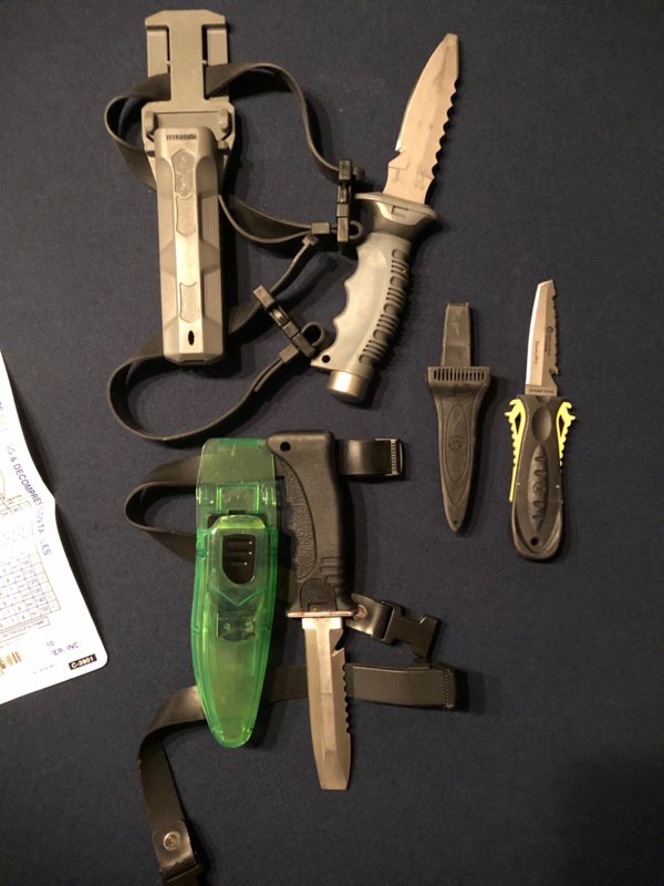 Dacor blunt tip stainless steel diving knife with locking sheath and two pressure compensating straps. $20 plus shipping.