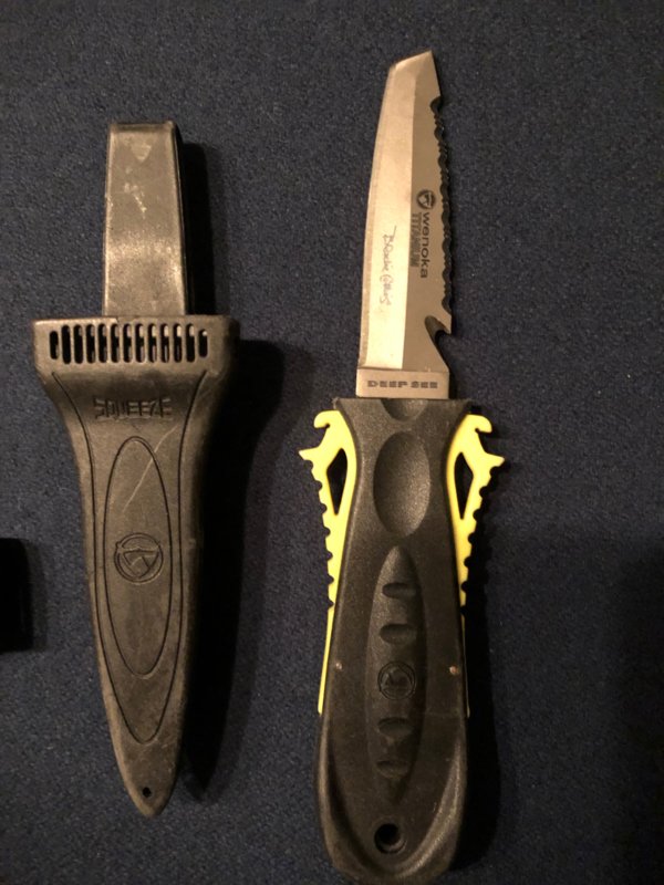 SCUBA Max Titanium blunt tip dive knife with line cutter and sheath. $60 plus shipping.