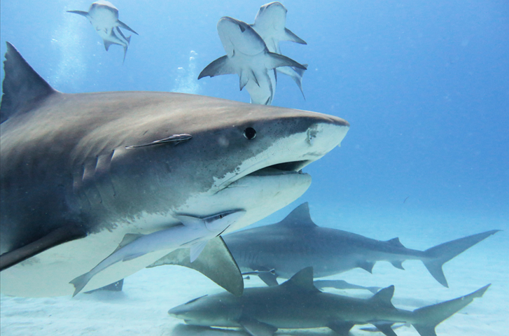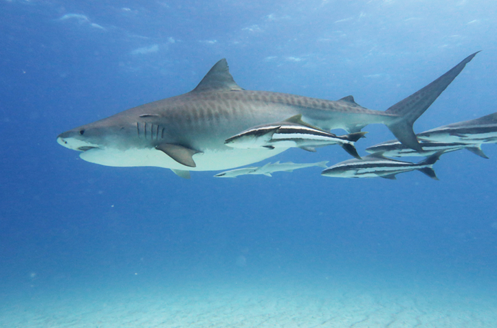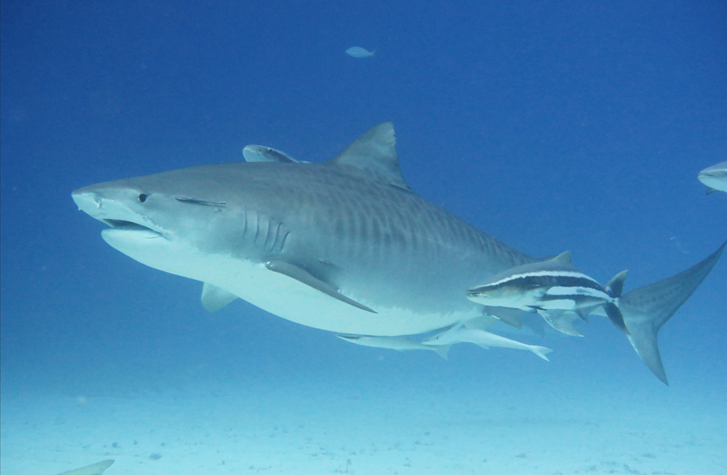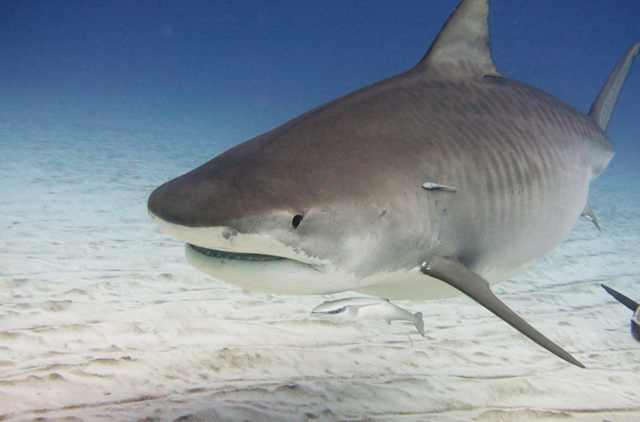 Beautiful images. Obviously the main subject is the Tiger Shark, but I am struck at large size of the Whitefin Sharksuckers in it's entourage.