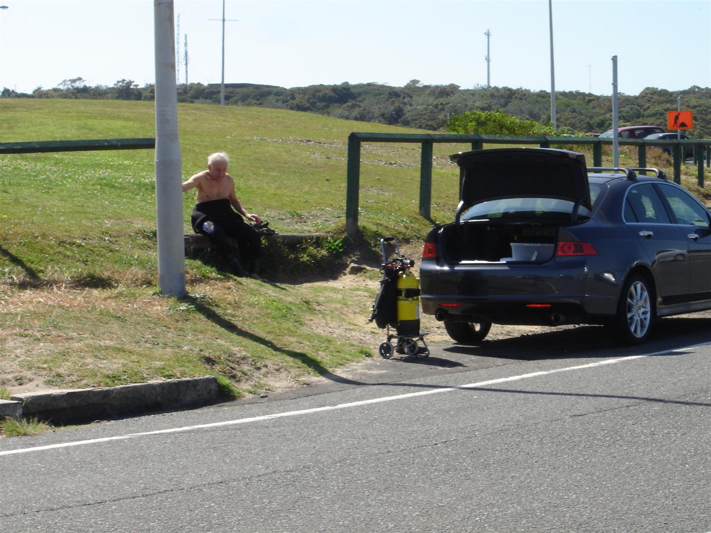 We see him diving regularly and his only concession is that he takes his tank and weights across the bridge and rock platform in a golf bag trolley!