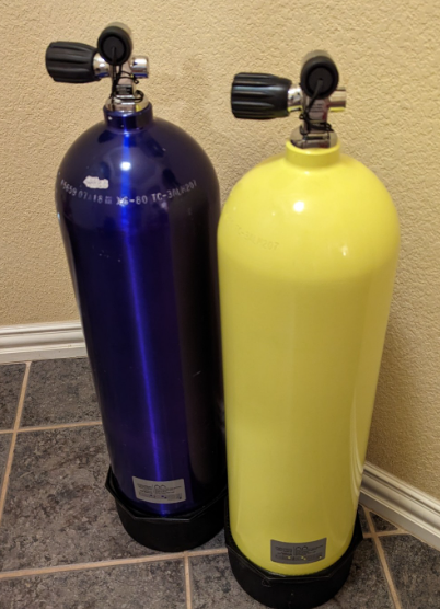 The 80s were new acquisition craigslist bargain finds I had hydro tested last month so first inspection for me (one at 59 months, one at 57 months but hell, give up a couple months and do it in one trip to the fire extinguisher service shop across town). Cleaned, rubbed vigorously with various rubbing compounds to get the "fish scale" etching out of the paint (damnable tank mesh wraps) and carnuba wax for that shiny, fresh-from-shop appeal. I think they tuned out good for a cheap purchase.