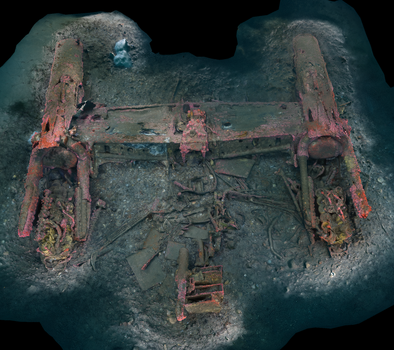 Here is a sample (low resolution) screen capture from the model. The "pink" color is due to the strawberry anemones and the yellow is from the anodizing of the engine cylinders on the twin Allison V12 engines. The white "blobs" around the edges of the wreck are clumps of squid eggs.