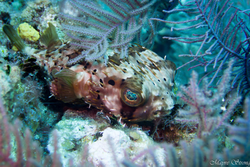 Our dive sites were located in the Northwest Point Marine Park or West Caicos. We were not able to make it to French Cay this trip (we were told only about 20% of the excursions make it there due to wind conditions). We had been to Turks and Caicos on the Aggressor boat before and did not get to French Cay on that trip either. We enjoyed the variety of the dive sites selected. I love to find new critters and take photos so that I can later identify what was found. On this trip, new finds were an orange ball corallimorph, a roughback shrimp, a Cuban aglaja, Berolina’s aglaja, a red-orange ghost shrimp, a palehead blenny, a rusty goby, and a few finds we have rarely seen before including a batfish! Caribbean reef sharks were present on almost every dive. There was some coral disease present on some of the sites.