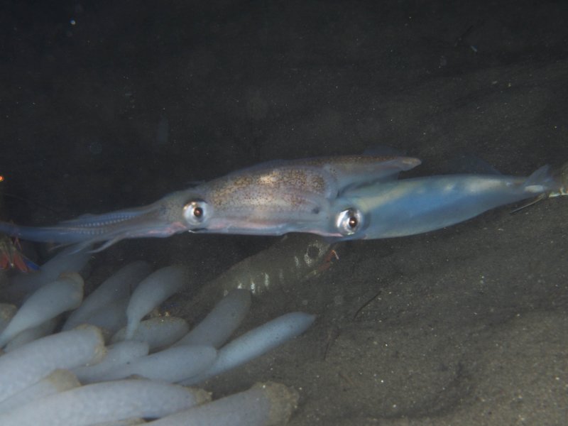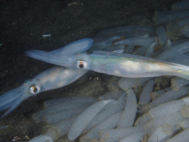 THAR BE SQUID - We had a FABULOUS dive last Wednesday night at Vets Park. Dana Rodda & Chris Menjou joined me for what we were hoping was going to be a successful squid dive and we were not disppointed. Even on the kick out through the shallows, we saw many Target Shrimp and crabs leading out to the canyon as well as a teeny Plainfin Midshipman and a California Lizardfish who was buried in the sand. Once we dropped into the canyon, there were many, many eggs and squid, mostly around 75 feet and deeper. They also seemed to be more prevalent heading south, using Main Stairs as your point of reference. Surf was maybe 1 foot with an occasional 1.5 footer, and I had 58º on my gauge at 70-80 feet, which is where the action was. Viz was about 20-30 feet throughout the dive. Dozens and dozens and dozens of mating squid, thousands of eggs in many clusters, hundreds of more Target Shrimp in the egg clusters or feasting on dying squid. (In case you didn't already know it, the squid mate and then die.) There were also Cusk Eels, Sarcastic Fringeheads, and even a really big Sheep Crab. We had a phenomenal squid run in August of 2013 but 2014 and 2015 were so-so at best. Although the season (at least for Vets) is considered to be mid-December to mid-March, it can vary in both timing and intensity. But this one's off to a good start so hopefully it's a really good season and we'll have many more exciting night dives to come. I didn't have a camera with me but Chris Menjou did and here are a couple of shots he had showing both the mating squid (note the red tentacles on the male in the middle pix) and the female forming the egg sac to plant (lower):