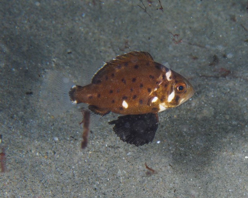 BLACK SEA BASS BONUS - And if the squid themselves weren't enough to make it a great dive, we got a BSB Bonus on the kick back in when we ran into not one, but TWO juvy Black Sea Bass drifting to and fro in the sand. One (top) is younger than the other and, based on what our juvy at the Aquarium looks like, I'm guessing the second one is at least 90 days old. First one is a little less than an inch long and the second is maybe an inch-and-a-half. Chris got a couple of shots of these guys too. Note that you can just barely see a hint of spots on the first (younger) one but they're quite evident on the second one. And especially on the second one, you can see the transparent caudal (tail) and anal fins: