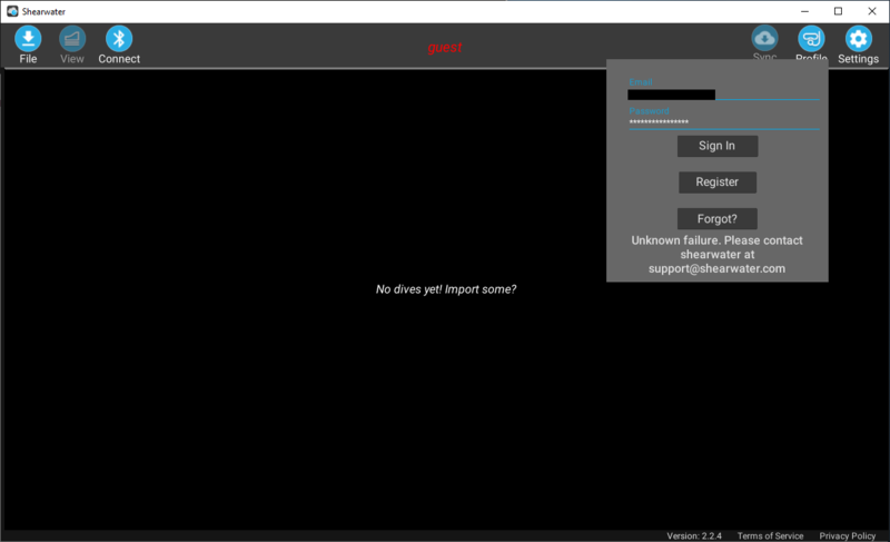 I'm 100% sure that email/passwort are correct, since I copy&pasted them, the credentials work fine in the Android version of Shearwater cloud. I'm not even sure if the application really tries to connect to the cloud service, as intentionally entering a wrong password leads to the same message.