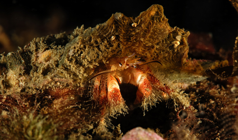 Paguristes sp. Greg Jensen said this undescribed hermit crab's southern range was Santa Barbara. I've found four at Golf Ball Reef.