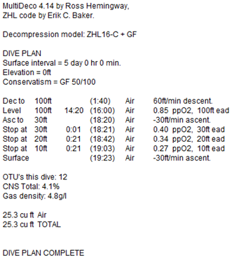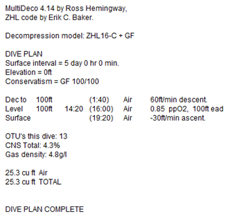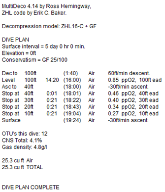 Here are the details from the dive comparison I mentioned above. The dive is to 270 feet for 17 minutes using 14/55 with 50% and 100% for deco. The dive is at 5,400 feet. I left out the obvious gas switches, and I did not include the use of a travel gas. I had been diddlying around during the day and had to reenter values. The numbers did not come out exactly as they did earlier in the day with the Shearwater, but they are pretty close.
